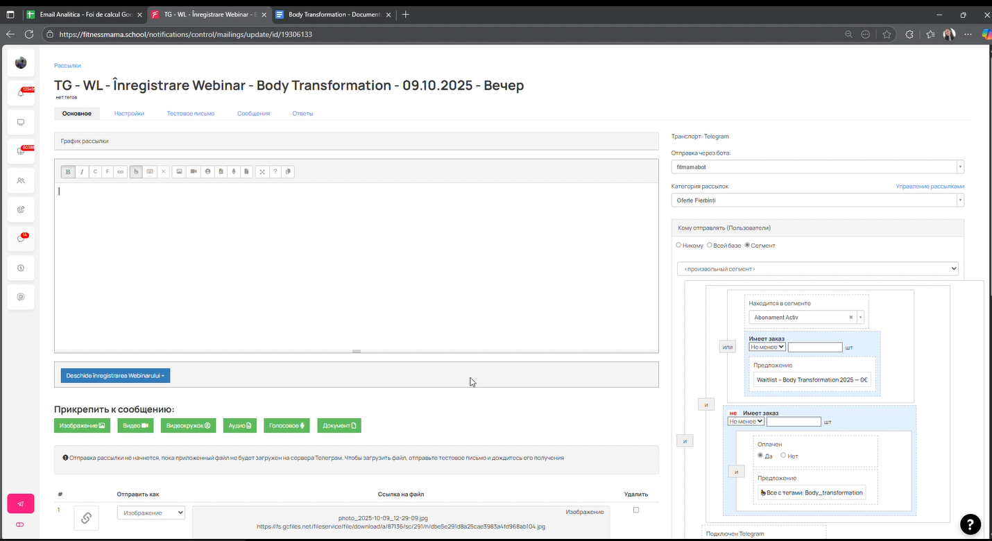Это механика для писем по телеграмм боту и для Лайва, после регистрации, по базе...
