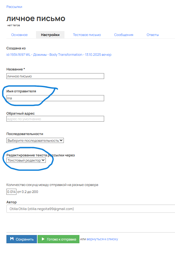 Меняем Имя отправителя на Ina и ставим текстовый редактор